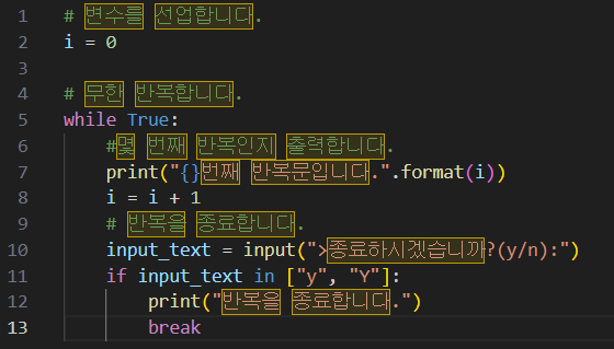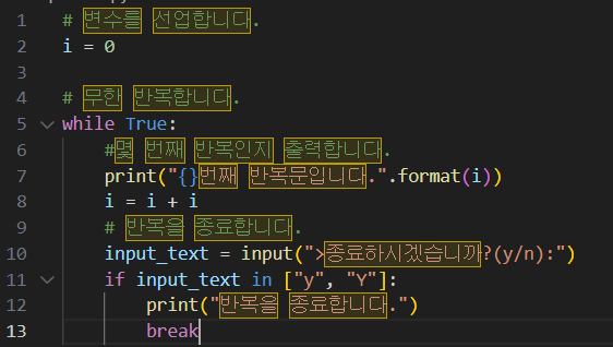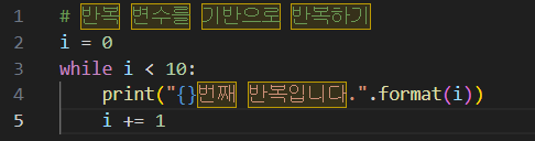 - while 반복문에서 가장 중요한 키워드는 조건입니다. (조건을 활용해서 반복을 사용해야 한다면 while 반복문을 사용하는 것이 좋습니다.)