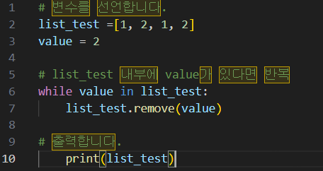 * 리스트 내부에 있는 보든 2가 제거될 때까지 반복하기 때문에 2가 모두 제거된 결과가 출력됩니다.