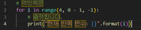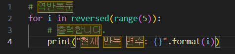 * reversed() 함수와 반복문을 조합할 떄는 함수의 결과를 여러 번 활용하지 않고 다음과 같이 for 구문 내부에