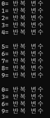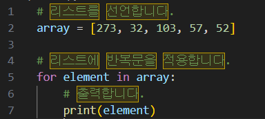 | 방법 2) example_list = ["요소A", "요소B", "요소C"] for i in range(len(example_list)): print("{ }번째 요소는 { }입니다. ".format(i, example_list[ i ])) |