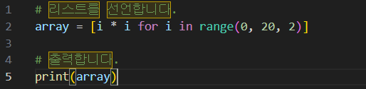 : 프로그램을 만들 때는 반복문을 사용해 리스트를 재조합하는 경우가 많습니다. 다음 코드는 range(0, 20 ,2)로 0부터 20 사이의 짝수를 구한 뒤, 제곱해서 새로운 리스트를 만듭니다.