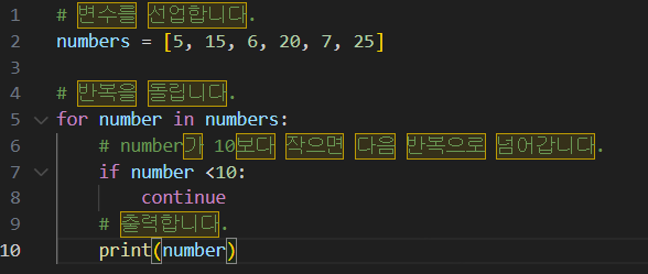 : 현재 반복을 생략하고, 다음 반복으로 넘어갈 때 사용하는 키워드 입니다.