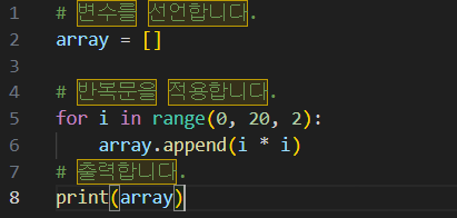 - 'range(0, 20, 2)의 요소를 i라고 할때 i * i로 리스트를 재조합해 주세요' 라는 코드입니다.