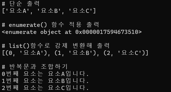 | 방법 1) example_list = ["요소A", "요소B", "요소C"] i = 0 for item in example_list: print("{ }번째 요소는 { }입니다.".format(i, item)) i += 1 |