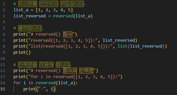 : - 리스트에서 요소의 순서를 뒤집고 싶을 때는 reversed() 함수를 사용합니다.