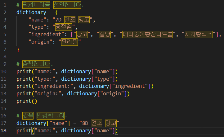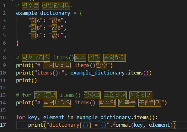 : 딕셔너리는 items( ) 함수와 함께 사용하면 키와 값을 조합해서 쉽게 반복문을 작성할 수 있습니다.