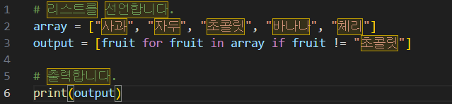 output = [fruit for fruit in array if fruit != "초콜릿"] |
