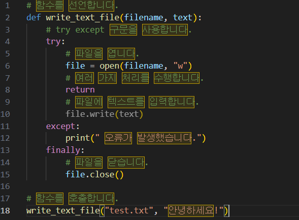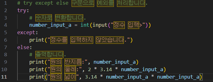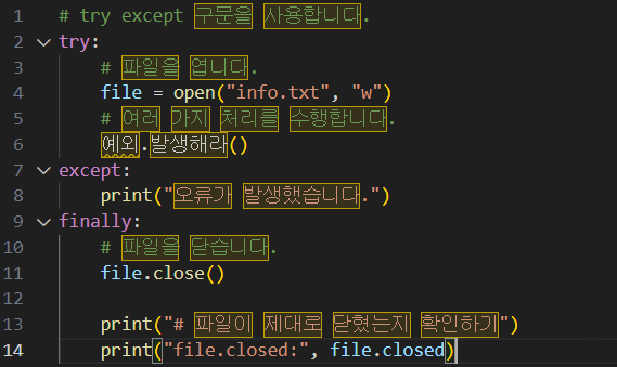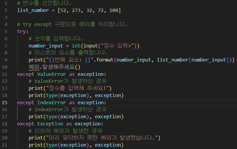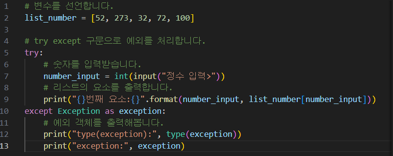 예외가 발생할 가능성이 있는 코드를 모두 try 구문 안에 넣고 예외가 발생했을 때 실행할 코드를 모두 exept 구문 안에 넣으면 됩니다.