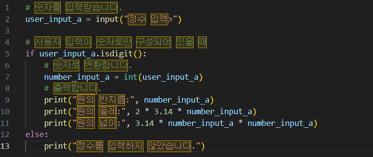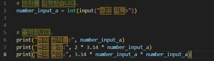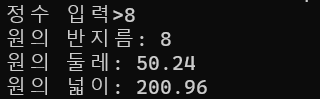 | # 숫자를 입력받습니다. number_input_a = int(input("정수 입력> ")) # 출력합니다. print(" 원의 반지름:" , number_input_a) print(" 원의 둘레:" , 2 * 3.14 * number_input_a) print(" 원의 넓이:" , 3.14 * number_input_a number_input_a) |