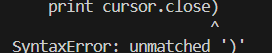 | # 프로그램 시작 print ("# 프로그램이 시작되었습니다.!") # 구문 오류 발생 코드 print("# 예외를 강제로 발생시켜 볼게요!) -------> 닫는 따옴표로 문자열을 닫지 않았습니다. |