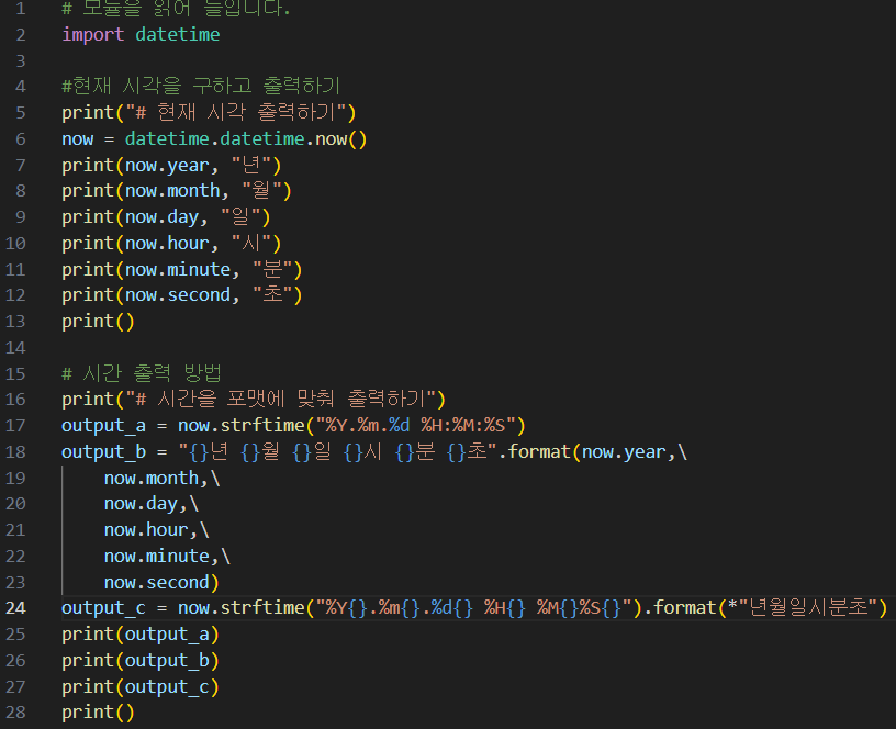 datetime 모듈: date(날짜), time(시간)과 관련된 모듈로, 날짜 형식을 만들 때 자주 사용되는 코드들로 구성되어 있습니다.
