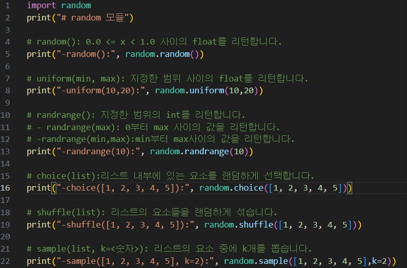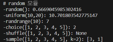 : 랜덤한 값을 생성할 때 사용하는 모듈입니다.