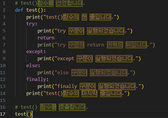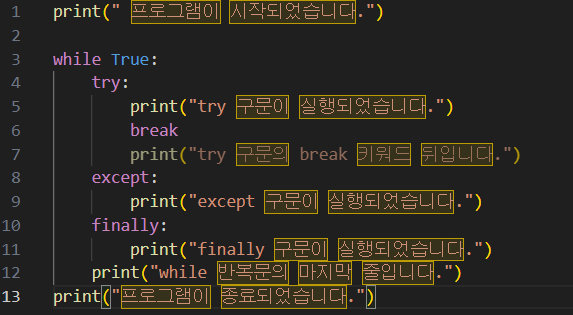● try 구문은 단독으로 사용할 수 없으며, 반드시 except 구문 또는 finally 구문과 함께 사용해야 합니다.