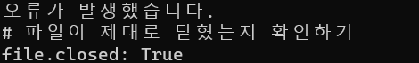 반대로 구문 오류는 실행 자체가 안 되므로 try except 구문으로 처리할 수 없습니다.