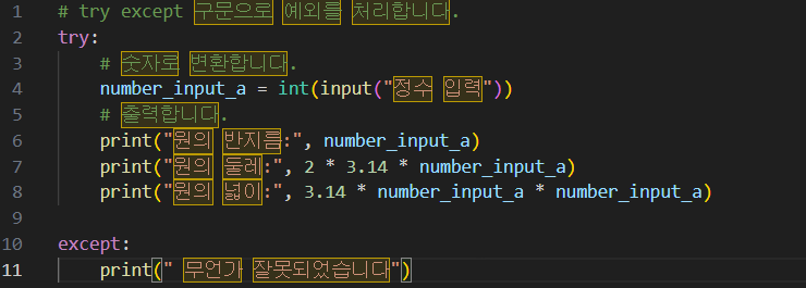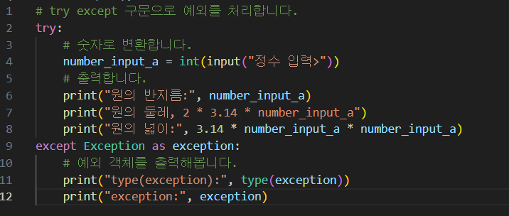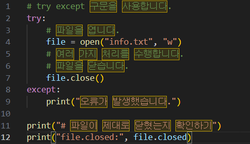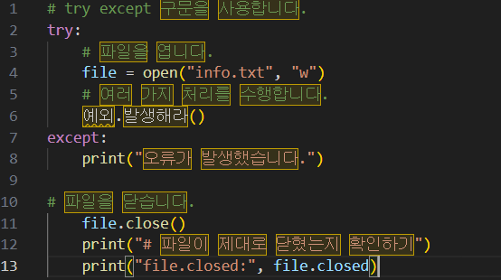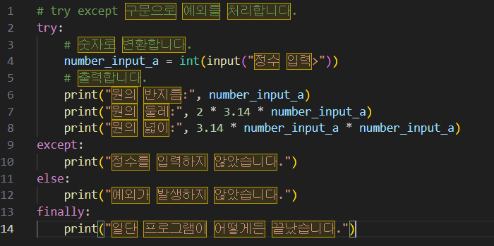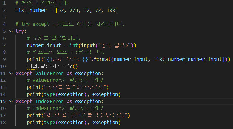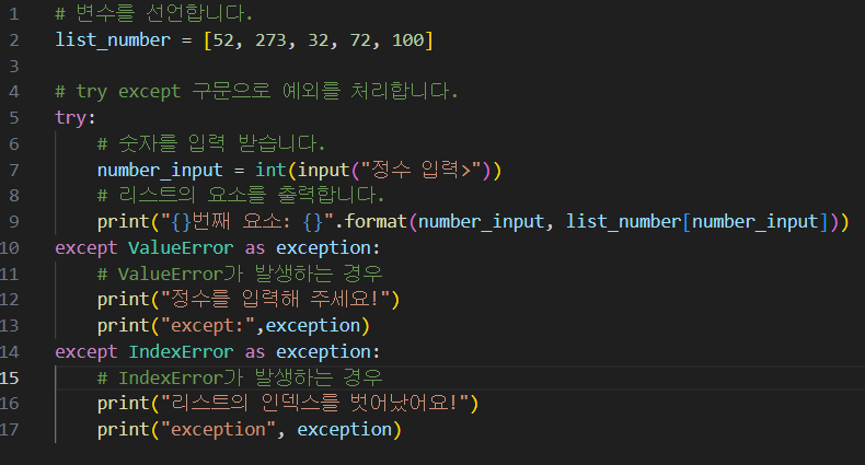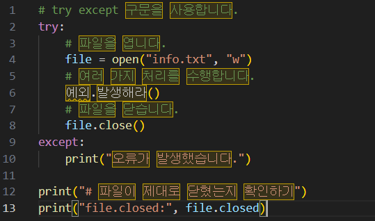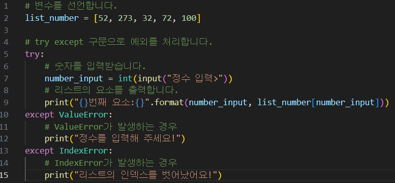 예외가 발생할 가능성이 있는 코드를 모두 try 구문 안에 넣고 예외가 발생했을 때 실행할 코드를 모두 exept 구문 안에 넣으면 됩니다.