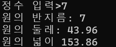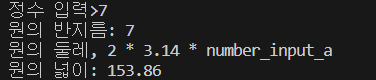 | # 숫자를 입력받습니다. number_input_a = int(input("정수 입력> ")) # 출력합니다. print(" 원의 반지름:" , number_input_a) print(" 원의 둘레:" , 2 * 3.14 * number_input_a) print(" 원의 넓이:" , 3.14 * number_input_a number_input_a) |