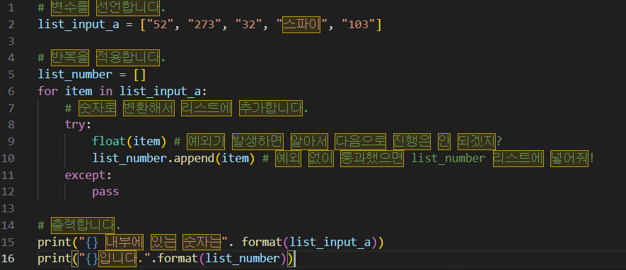 - 숫자로 변환할 수 없는 문자열이라면 float(item)를 실행할 때 예외가 발생합니다. 따라서 이를 이용해서 try except 구문으로 감싸고 예외가 발생하지 않는 경우에만 list_number.append(item)가 실행되도록 만드는 코드입니다.
