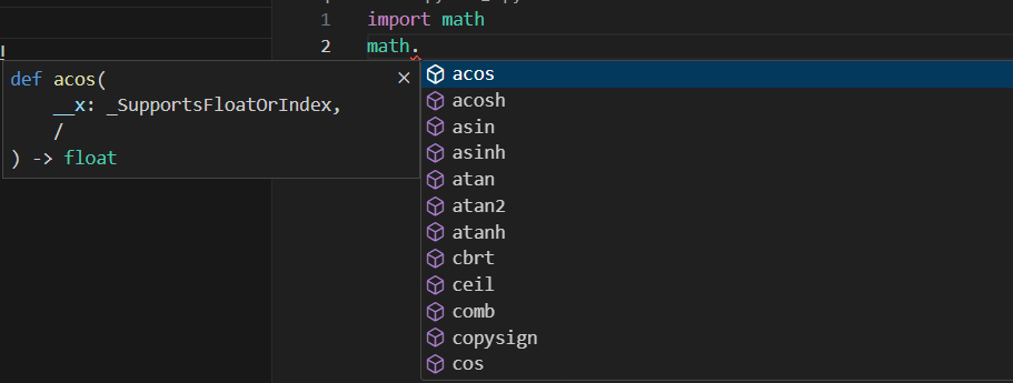 자동 완성 기능으러 살펴보는 math 모듈의 변수와 함수