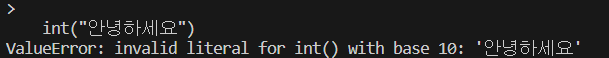 | 정수 입력> 7센티미터 (Enter) ------> 정수로 변환할 수 없는 문자열을 입력했습니다. Traceback (most recent call last): File "test.py" , line 2, in <module> number_input_a = int(input("정수 입력> ")) ValueError: invalid literal for int() with base 10: '7센티미터' |