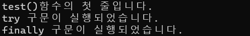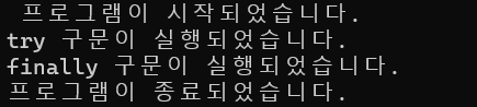 두 가지 경우 모두 "일단 프로그램이 어떻게든 끝났습니다."라고 finally 구문이 실행되는 모습을 볼 수 있습니다.