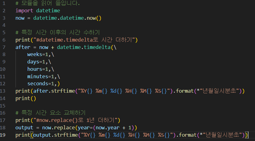 timedelta()함수 를 사용하면 특정한 시간의 이전 또는 이후를 구할 수 있습니다.