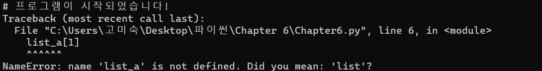 | # 프로그램이 시작되었습니다! ------> 여기까지는 프로그램이 정상으로 실행되었다는 것을 확인할 수 있습니다. Traceback (most recent call last) File "test.py" , line 5, in <module> list_a[1] NameError: name 'list_a' is not defined |
