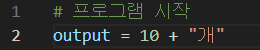 | output = 10 + "개" # 1. int("안녕하세요") # 2. cursor.close) # 3. [1, 2, 3, 4, 5][10] # 4. |